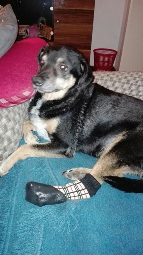 Er ist nun schon 15 Jahre alt, bekommt Herztabletten, hat eine chronische Hornhautentzüngung und braucht aufgrund seiner Narbe am Bein jetzt einen Stiefel bei nasskaltem Wetter.