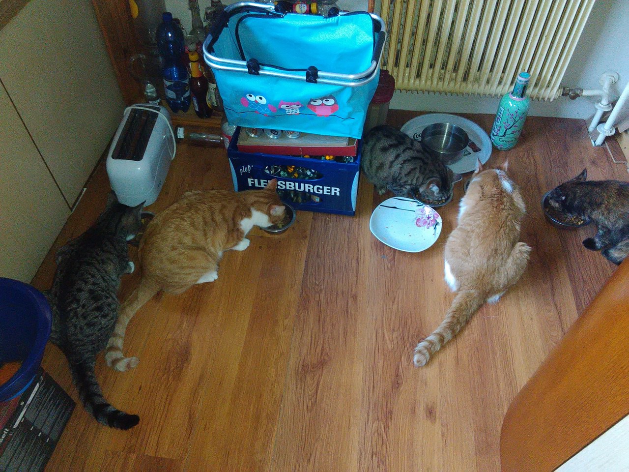 Mittlerweile kommt er aus am Tag raus, schmiegt sich an die Diva und spielt auch mit ihm, fisst auch schon mit den anderen Katzen, kommt uns guten Morgen sagen, sitzt gern auf dem Balkon und spielt nur mit dem Spielzeug was auch unser Diva Kater zum spielen verwendet.