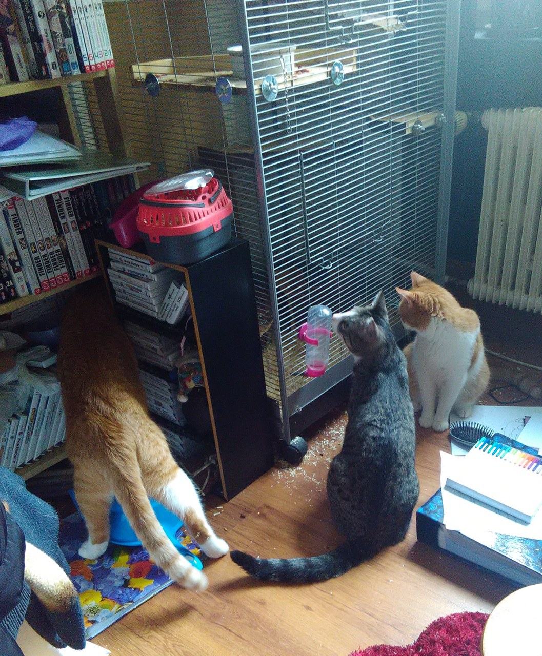 Mit dem Muskelpacket versteht er sich eigentlich auch, nur wenn der 8kg schwere Kater auf ihm zu rennt versteckt er sich und faucht.