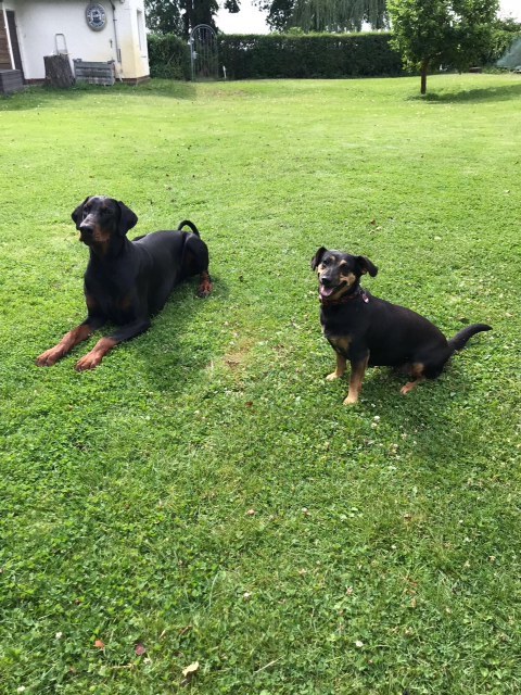 Andere Hunde mag ich nicht so doll, obwohl Frauchen mit mir öfter zu einer Spielstunde auf einem Hundeplatz gefahren ist, nur mit meinem Dobermann-Freund Pinoccio komme ich prima klar. Andere Hunde belle ich oft an, nur am Hundestrand an der Ostsee nicht, da waren aber auch mindestens 50 oder mehr. Auch wenn Herrchen und Frauchen eine Radtour machen, kann ich mit, manchmal im Körbchen, aber wo es passt, darf ich auch mal vorneweg rennen, klasse. Wünsche euch auch alles Gute. "
