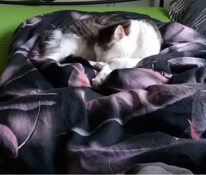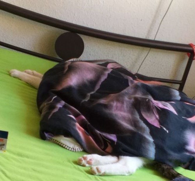 Wie ihr auch sehen könnt, habe ich ein ganz großes Bett als Liegeplatz (fast) für mich alleine. Und wenn ich nicht über der Decke bin verbringe ich gerne darunter meine Zeit oder sitze vor dem Fenster oder kuschel ganz viel mit meinem Frauchen.