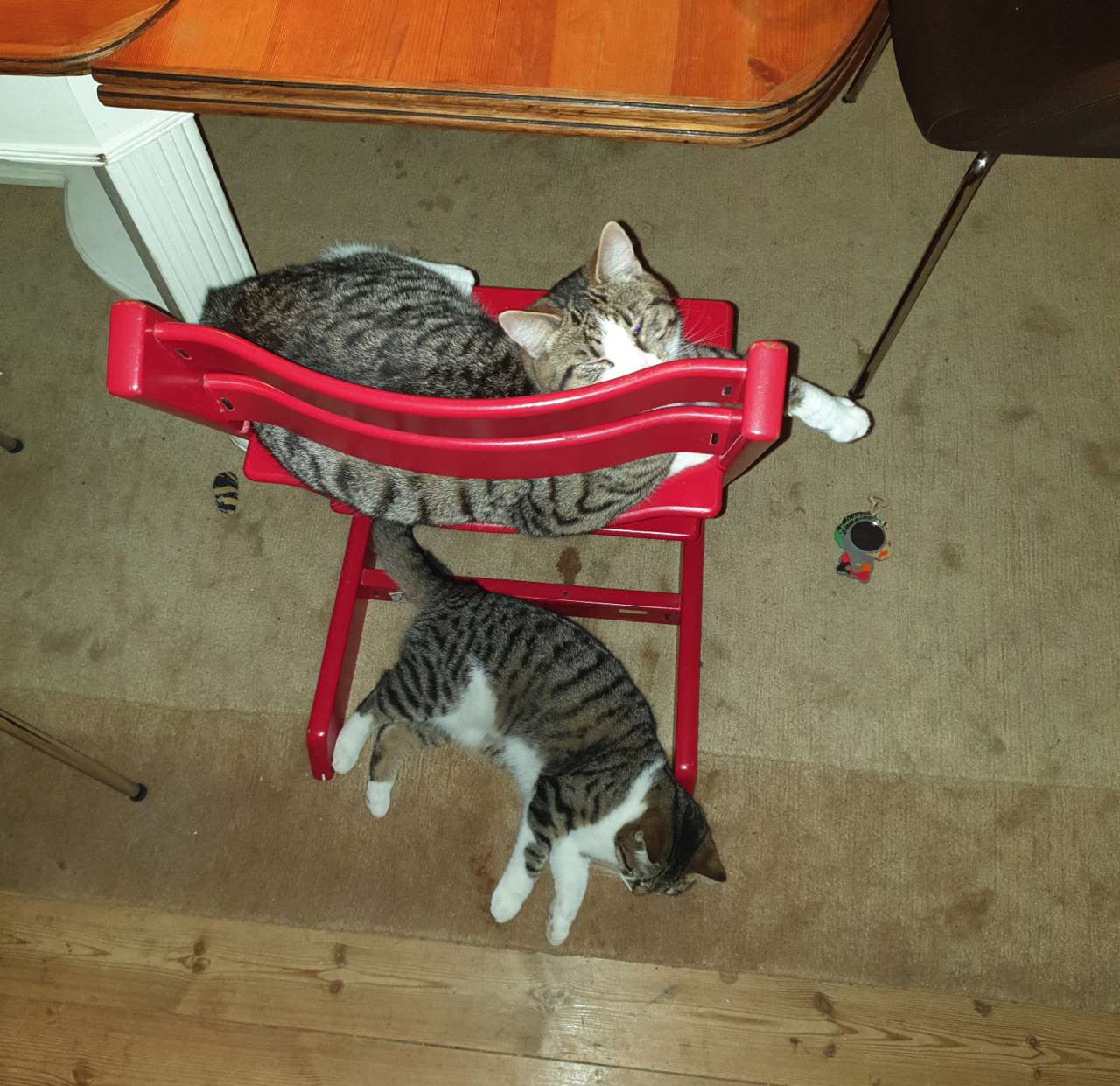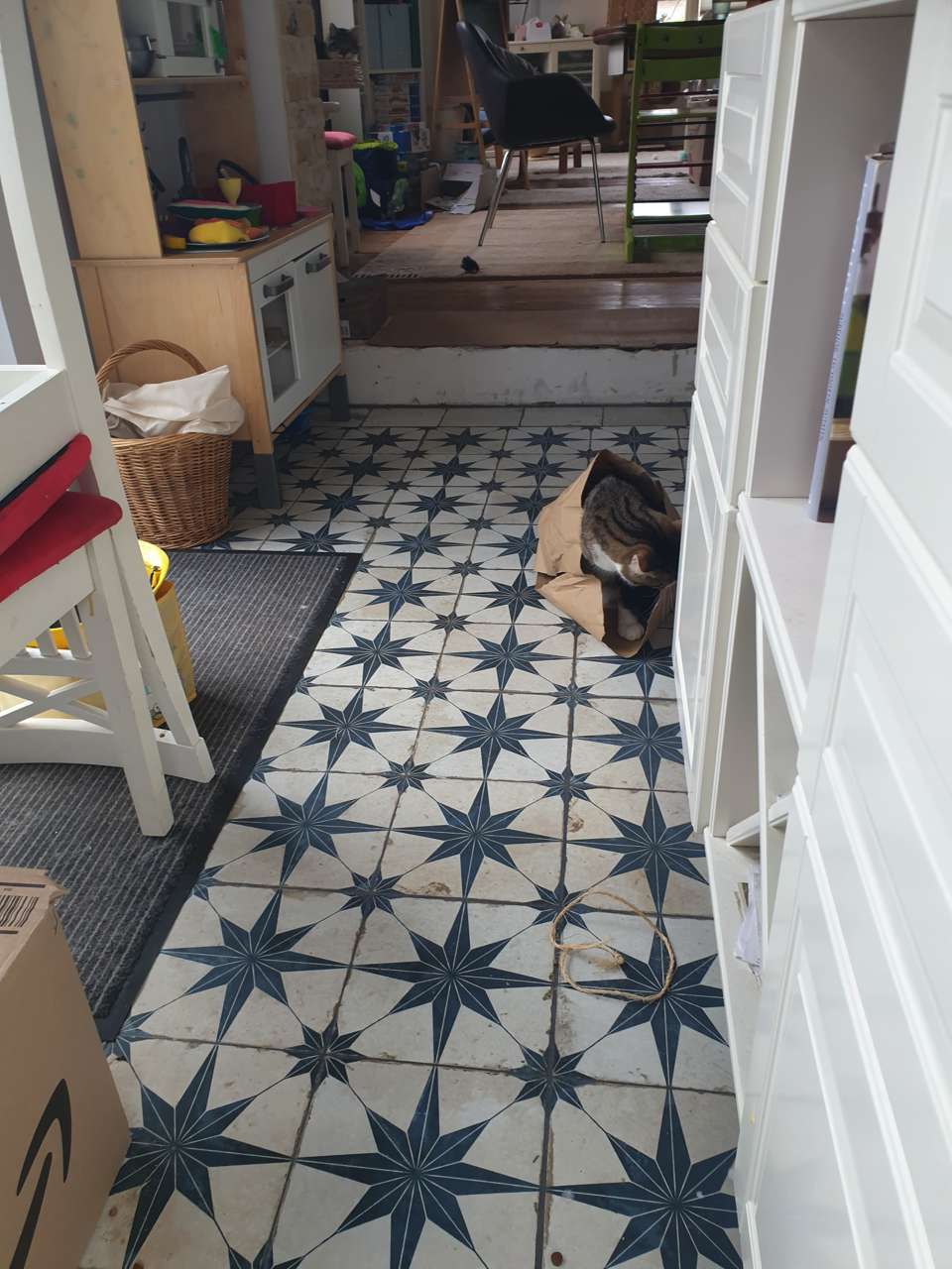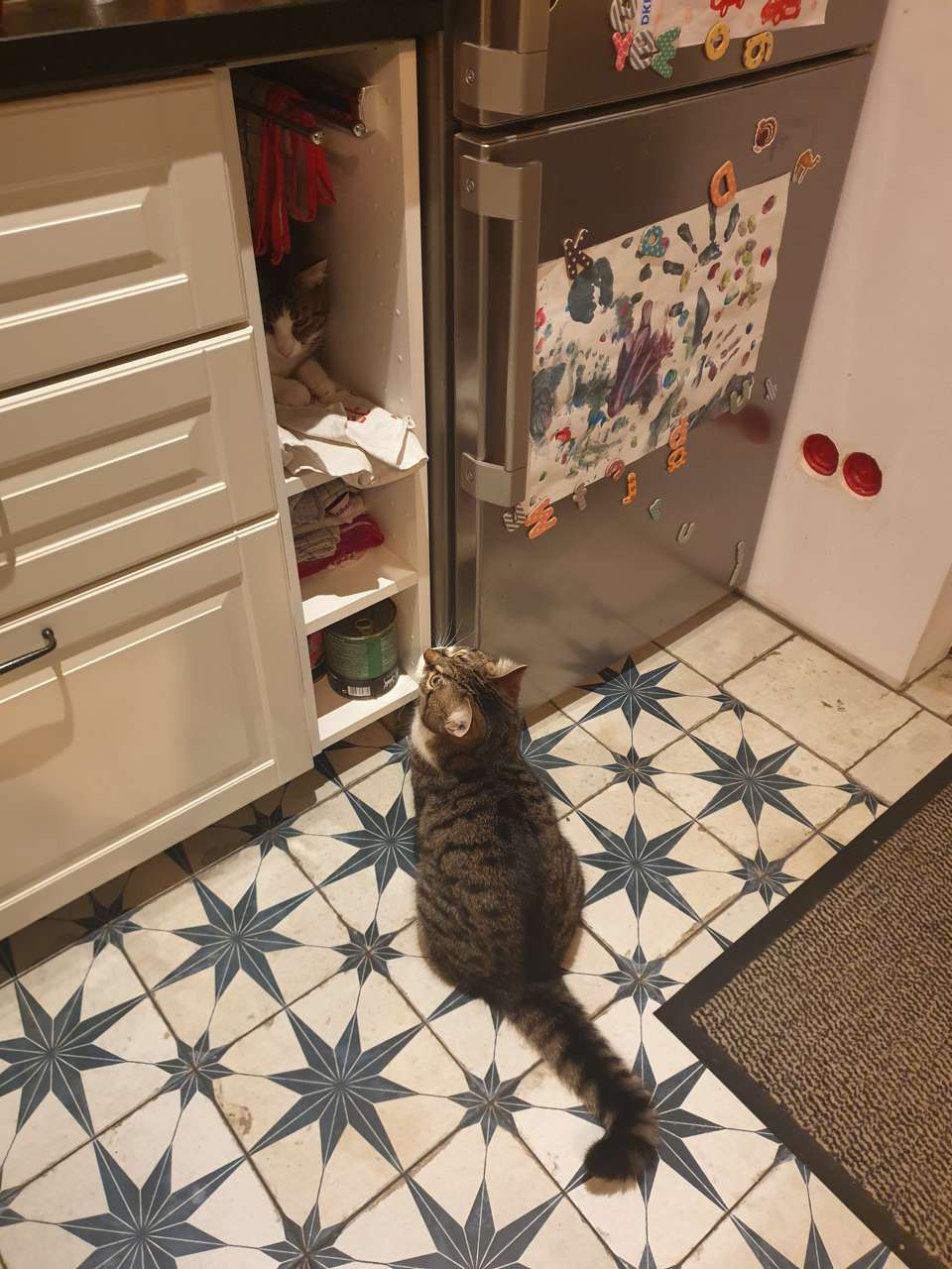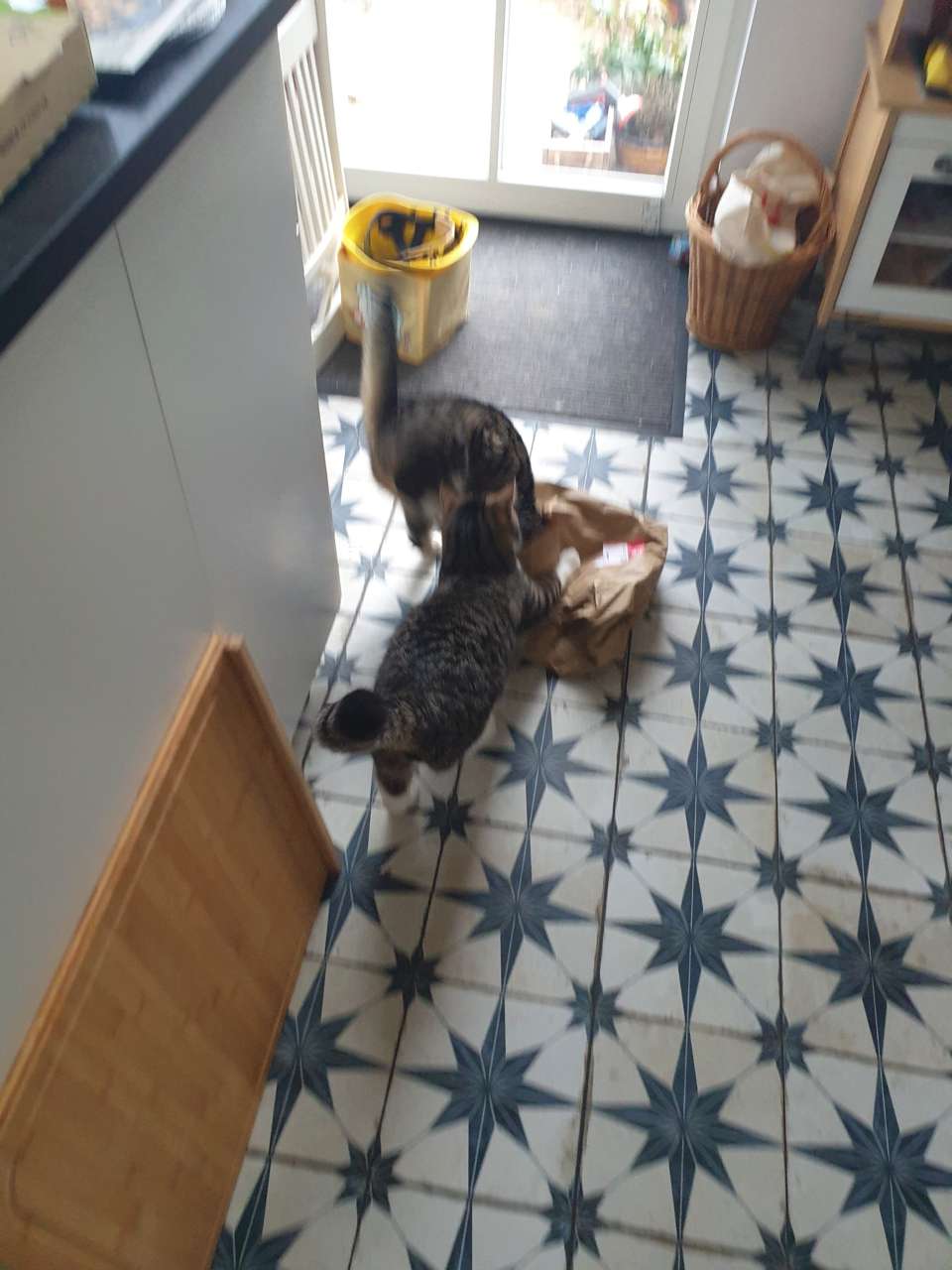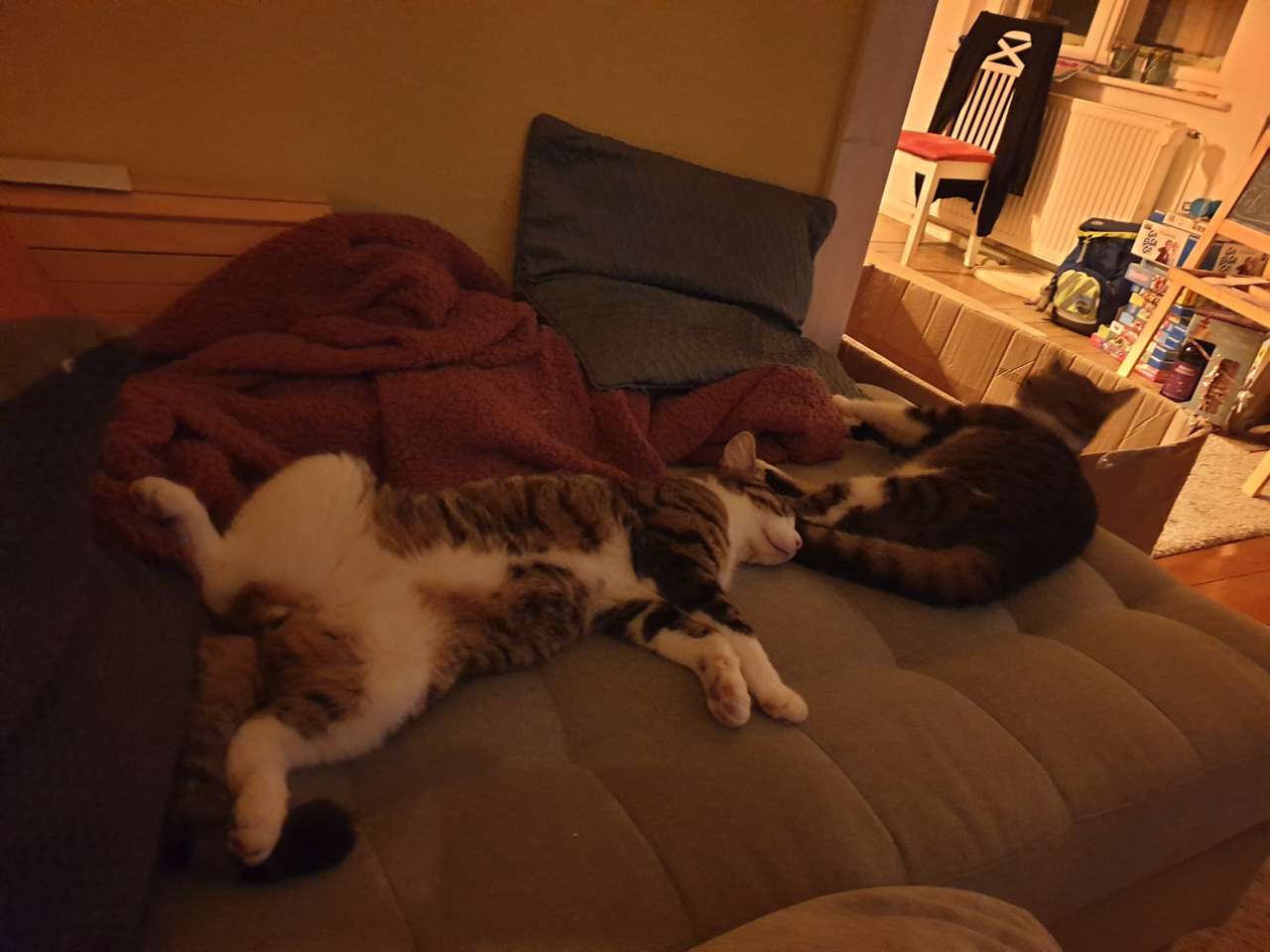 zwei Verrückte toben nun durch unser Haus und haben neben der Tüte in der Küche auch alle anderen Räume und Möbel in Beschlag genommen. Die Kinder haben "ihren" Katzen wundervolle neue klangvolle Namen gegeben. Rocker und Pinky haben sich damit sehr gut arrangiert, sind kuschelig und anhänglich wie eh und je. Und sie sind verspielt und wirbeln unsere Tage ordentlich durcheinander.