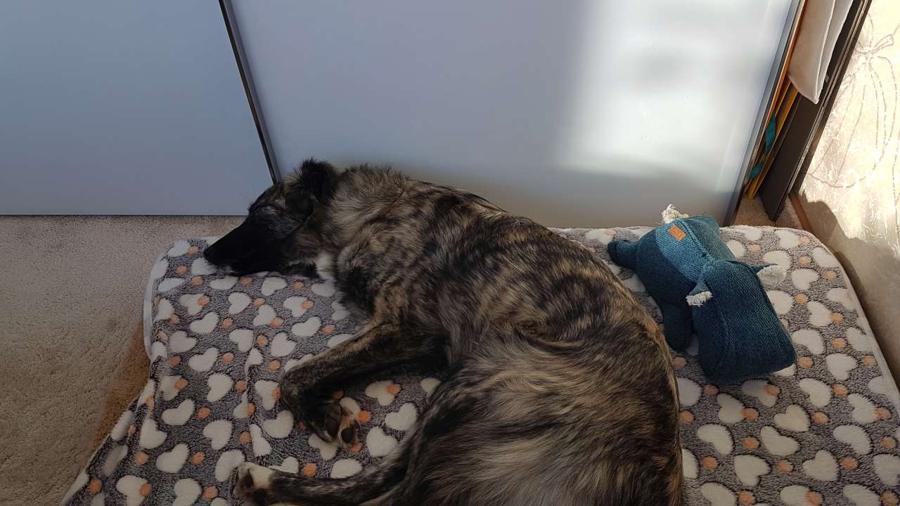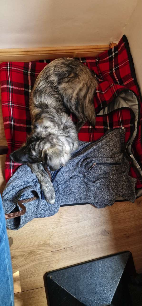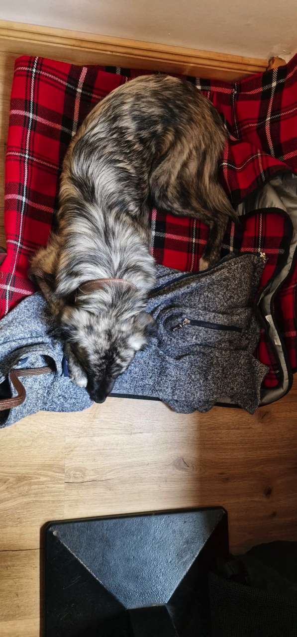 Und noch eine weitere Sache gibt's zu berichten. Frauchen hat irgendwelche Geheimnisse vor mir. Es begann schon am Montag. Sie nahm die Schlüssel, ging raus, fuhr mit dem Fahrstuhl runter und wieder rauf und war dann wieder da. Komisch. Am Dienstag dasselbe Spiel, sie nimmt die Schlüssel, dieses Mal einen grünen Sack mit, fährt Fahrstuhl runter und wieder rauf. Komisch. Ich sitze vorm Körbchen und warte leise. Gestern hat sie dann so ein rundes Ding mitgenommen. Es hat kurz gepiept, dann ist sie raus und kam fünf Minuten später wieder. Mir war das zu doof, auf sie zu warten. Ich lag im Körbchen. Sie kommt ja sowieso immer gleich wieder. Im Anhang sende ich euch noch zwei Fotos von mir, wie ich entspannt schlummere. Frauchen hat zwei wirklich coole Plätze eingerichtet, die ich richtig doll mag.