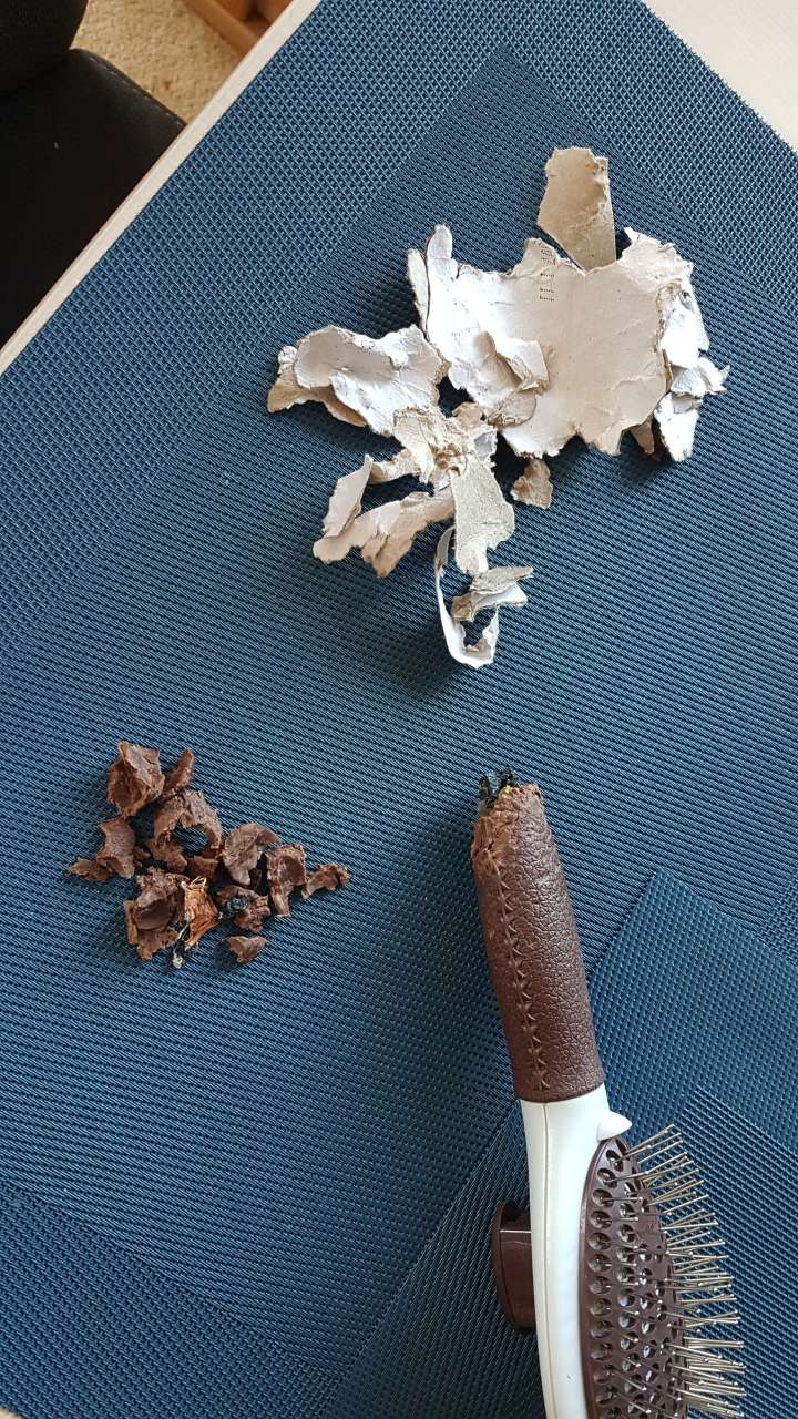 Zuhause wird jedenfalls alles abgemacht außer dem Zeckenhalsband. Es gibt da inzwischen eine richtig schöne Routine. Wenn wir reinkommen, wird alles in Ruhe abgemacht, aber ich soll noch stehenbleiben. Dann nimmt Frauchen einen Kamm und kämmt mich kurz durch. Und dann krabbelt sie mich mit den Händen durch. Das mag ich voll. Zum Schluss gibt's ein Küsschen auf den Kopf und dann darf ich ins Wohnzimmer.