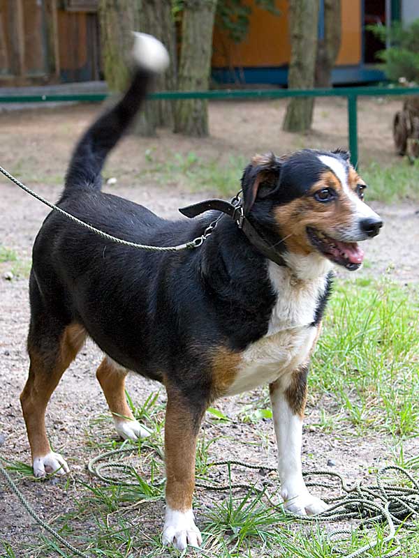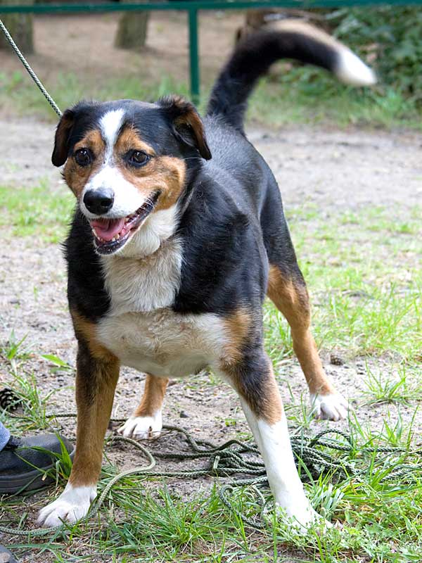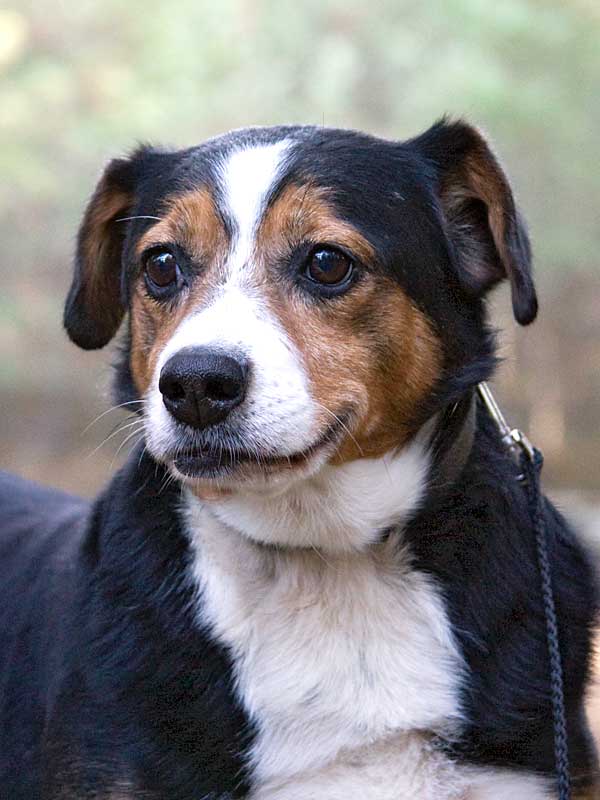 Lenny sieht man den Entlebucher Sennenhund deutlich an, denn seine wunderschöne dreifarbige Fellzeichnung verrät gleich, was in ihm steckt.