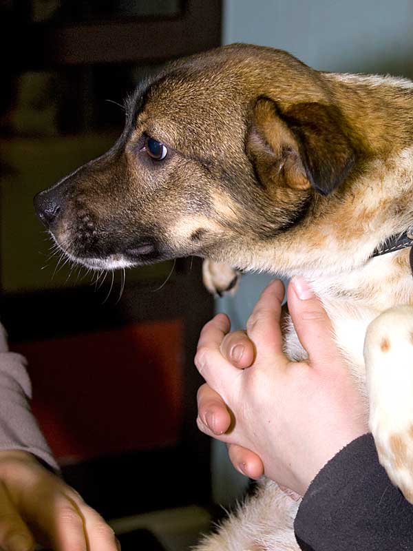 Jasmin kam verletzt zu uns. Aber obwohl sie erst wenige Minuten bei uns war, ließ sich die unkomplizierte Hündin ohne Murren auf den Arm nehmen und ihre Wunden versorgen.