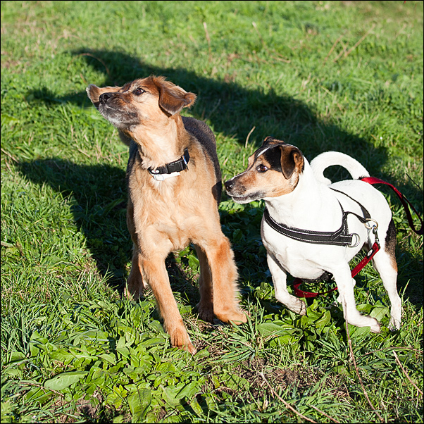 Wider Erwarten muss ihm wohl bei der ersten Begegnung eingefallen sein, dass da irgendwo ein Teil Jagdhund in ihm steckt. Inzwischen laufen ihm die Miezen aber vor der Nase rum und es juckt ihn gar nicht mehr.