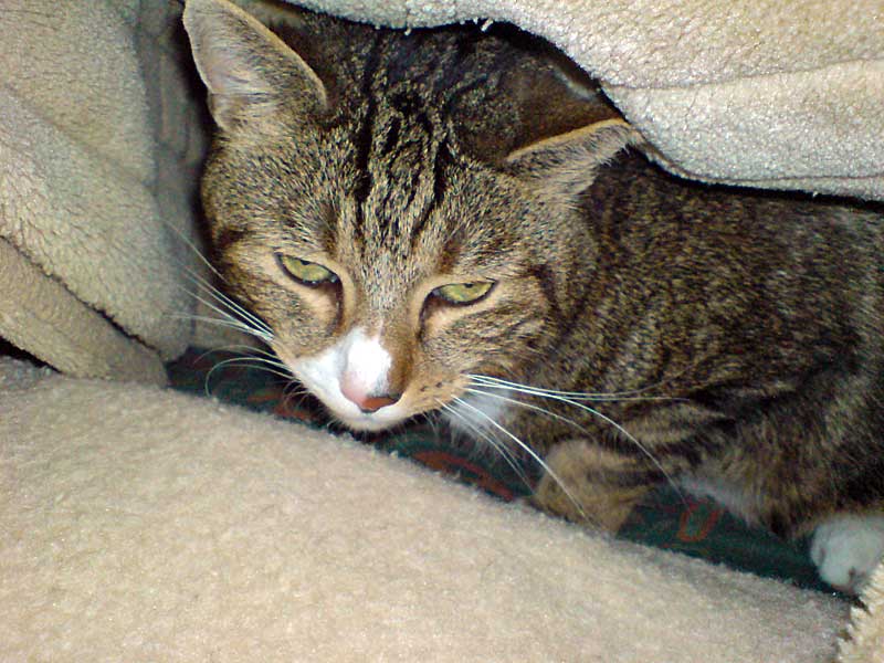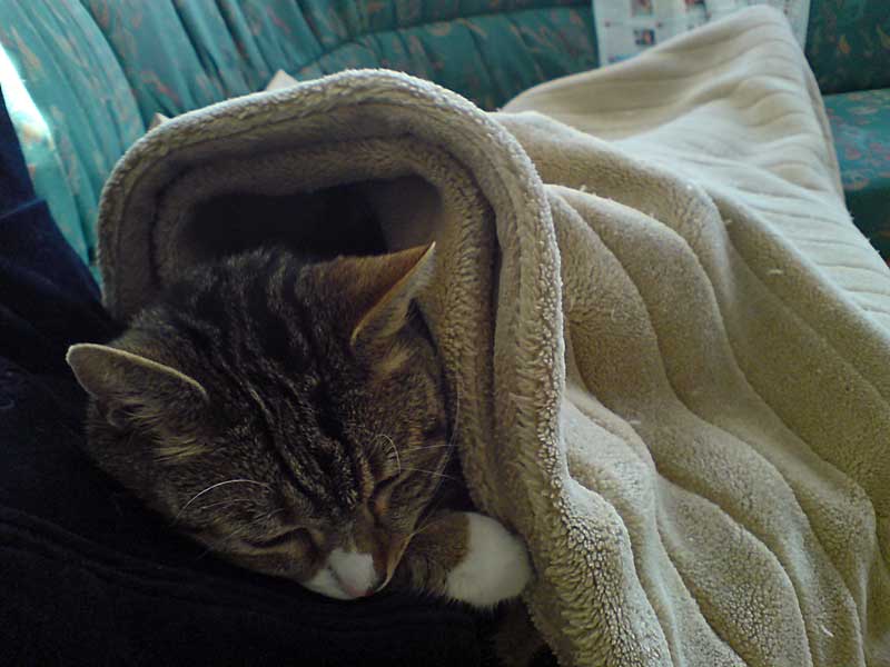 Nach anfänglich kurzem Verstecken hinter einem Küchenschrank war bereits am Abend des Einzugstages ein Platz auf unserem Sofa ausgesucht. Bandit muss gemerkt haben, dass es ihm bei uns gut geht, denn er fasste unheimlich schnell Vertrauen. Seine Lieblingsplätze sind auf und vorrangig unter der Kuscheldecke, in der Badewanne (wenn kein Wasser drin ist, da sitzt er sonst nur am Rand und schaut), auf dem Abfalleimer in der Küche (warum auch immer) und sein flauschiger Kratzbaum.