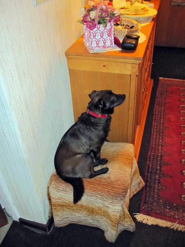 Trotzdem war es mir ein bisschen unheimlich am Anfang, und vorsichtshalber habe ich mir in der ersten Nacht bei Frauchen lieber einen Platz unter dem Küchentisch ausgesucht und mich erst mal an die Wand gedrückt. Sehr bequem war das nicht, aber sicher ist sicher, so allein in der Fremde und ohne meine Kameraden. Bald habe ich dann aber einen gepolsterten Hocker im Korridor entdeckt, auf dem ich die nächsten Tage fast ununterbrochen zugebracht habe. Noch heute ist es einer meiner Lieblingsplätze, da habe ich eine schöne Ecke und gleichzeitig kriege ich alles mit. Wo Frauchen gerade hingeht, wann die Nachbarn nachhause kommen oder ob Besuch kommt und all so was. Es ist ja nicht so, dass ich neugierig bin, aber ich muss ja auch ein bisschen auf alles aufpassen, nicht wahr ?