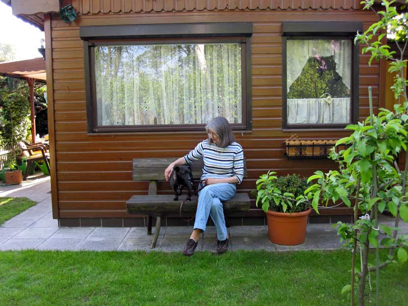 Ein Geschirr habe ich auch bekommen, damit fühle ich mich wohler, wenn wir unterwegs sind. Inzwischen habe ich Frauchen auch den Gefallen getan, „Sitz“ und „Down“ zu lernen und gehe auch öfters schon mal ganz ordentlich an der Leine, wenn ich nicht allzu beschäftigt bin, um auf „Fuß“ zu hören. Frauchen meint, wir müssen daran noch arbeiten. Sie hat das aus so schlauen Büchern, wo drin steht, was man als guter Hund so alles können und machen soll. Naja, wenn sie meint. Aber sonst lobt sie mich immer sehr. Und apropos Autofahren, ich steige jetzt immer ganz cool ins Auto und mache es mir auf dem Rücksitz bequem und fahre überall mit hin. Meinen eigenen kleinen Sicherheitsgurt habe ich natürlich auch. Meistens geht es ja auch dahin, wo es schön ist. Zum Beispiel in unseren Garten. Die Hollywoodschaukel ist ja nun meine, da kann ich stundenlang sitzen, habe alles im Blick, was vorüberkommt und was so los ist. Wir gehen an der Havel spazieren, die ist quasi vor der Tür. Da laufe ich dann an einer ganz langen Leine und das erste Mal habe ich einen richtigen Tobeanfall gekriegt, weil ich mal wieder so richtig rennen konnte. Frauchen rennt hier in der Stadt auch manchmal mit mir an der Leine, aber sie ist ja längst nicht so schnell wie ich. Vielleicht gehe ich im Sommer ja auch mal baden. Mal sehen.