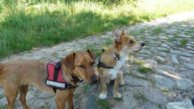 Neun Wochen sind wir Timmy und Anke nun bei unseren Zweibeinern. Nach anfänglichen Schwierigkeiten ist es uns gelungen, ihnen den richtigen Umgang mit uns beizubringen. Wir mögen es gar nicht, wenn unsere Futternäpfe leer sind und die Leckerlies so platziert sind, dass es einige Schwierigkeiten bereitet, sie während der kurzen Abwesenheit von Frauchen auseinanderzunehmen oder gar völlig aufzufressen. Daran müssen wir noch arbeiten.
