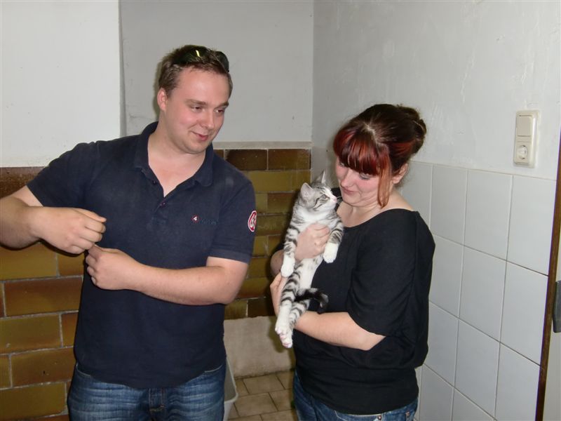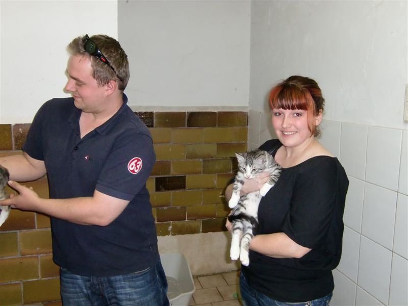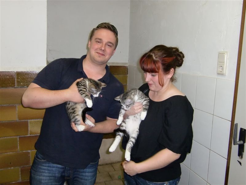 Da es an dem Tag sehr voll bei uns war, musste das junge Pärchen lange warten, bis die Vermittlung abgearbeitet werden konnte. Inzwischen war es nach 17 Uhr - just die Zeit, zu der ihre Pflegemama, bei der sie aufgewachsen waren, immer nach Hause kam und ausgiebig mit ihnen tobte und tollte. Im Kitten-Blog sind die Videos noch zu sehen.