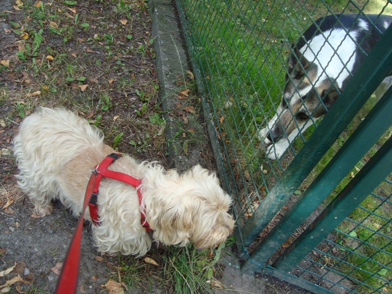 ich bin ganz schön beschäftigt seit ich hier in Teltow bei meinem neuen Rudel bin. Schon am Sonntag beim Gassigehen kamen viele Nachbarn, um mich zu begrüßen. Natürlich auch die Hundedame Skippy von nebenan, wie Ihr auf dem Foto sehen könnt. Sie hat gleich freundlich gewedelt und so nett wurde ich auch von zwei weiteren Hundedamen in den Nachbarstraßen begrüßt, nur einige Rüden hier sind ziemlich rüpelig und tönen laut rum. Die meisten Zweibeiner rufen: "Ach, wie süüß!" Auch der Tierarzt gestern war ganz entzückt von mir. Stellt euch vor, er hat mich anfangs für eine Dreijährige gehalten, weil meine Zähnchen so toll aussehen - na so was hören wir Damen doch immer gern. Leider hat ihm Frauchen verraten, dass ich um einiges älter bin. Es gab nur ein paar Tropfen ins Ohr - hat nicht weh getan. Die Tropfen heißen Surolan, das soll ich Euch mitteilen.