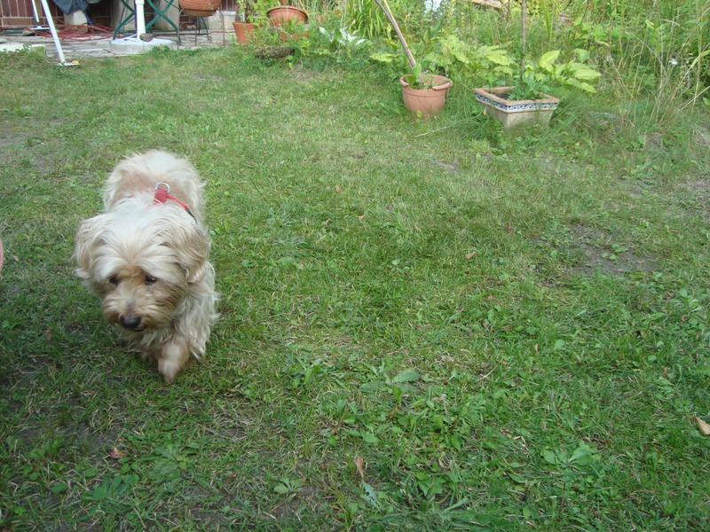 nun schickt Euch Frauchen weitere Fotos von mir, damit Ihr wisst, wie es mir geht. Also, der Garten ist O.K., aber am liebsten gehe ich nach draußen zum "Zeitunglesen" und da gibt es hier an jeder Ecke ne' Menge Neuigkeiten. Wir waren auch schon auf dem Mauerwander- und Radweg, damit ich das Ignorieren der Radler noch besser lerne. Eigentlich habe ich ja nur etwas gegen diese Raser, vor allem wenn sie männlich sind. Kinder lasse ich in Ruhe, die mag ich sogar sehr. Manchmal spielen hier vor dem Grundstück ein paar Knirpse Ball, da gucke ich gern zu. Am liebsten würde ich mitspielen, aber Frauchen meint, ich solle da noch etwas warten. Sie rollte mir auch mal einen Ball zu, aber nach zwei Minuten war das langweilig. Gleichfalls die Nummer mit dem Püppchen am Faden, das war nach kurzer Zeit nicht mehr so spannend. Muss sie sich eben etwas Neues einfallen lassen. Am meisten freuen sich meine Zweibeiner, wenn ich fröhlich knurrend über den Teppichläufer rattere und dabei Purzelbaum mache. Auch wenn ich nach Absolvierung meines Kosmetikprogramms mich ihren Zehen widme, können sie vor Lachen gar nicht richtig still halten.