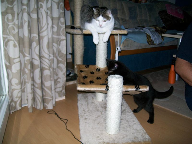 Am ersten Tag hatte mein Kumpel noch ein paar kleine Probleme mit mir,aber die hatten sich dann auch schnell gelegt :) . Mittlerweile teilen wir den Kratzbaum,die Fressnäpfe und er putzt mich auch schon minutenlang.Normalerweise würde eine Katzentoilette für uns reichen,aber die zweite wird auch fleissig benutzt.