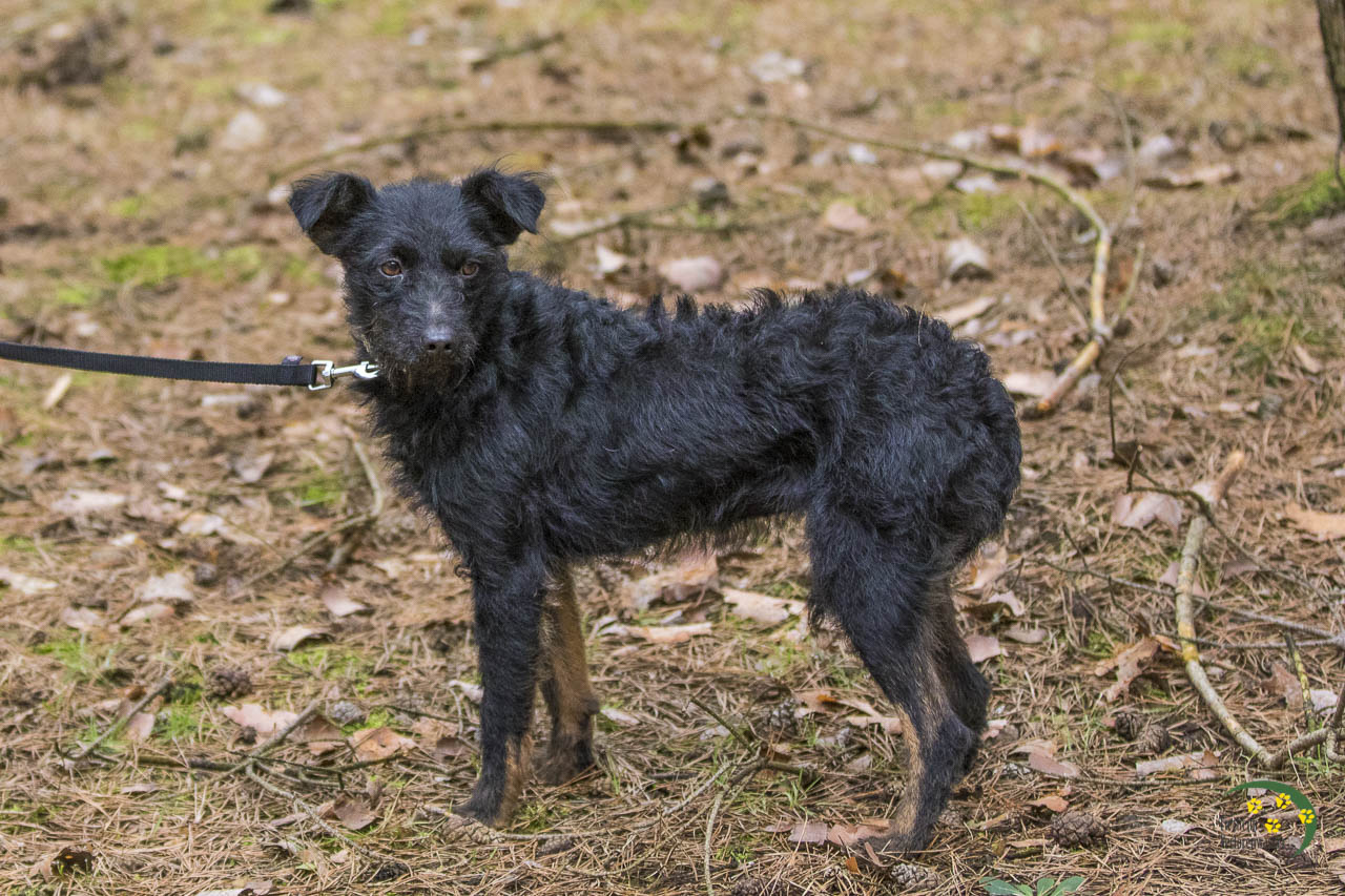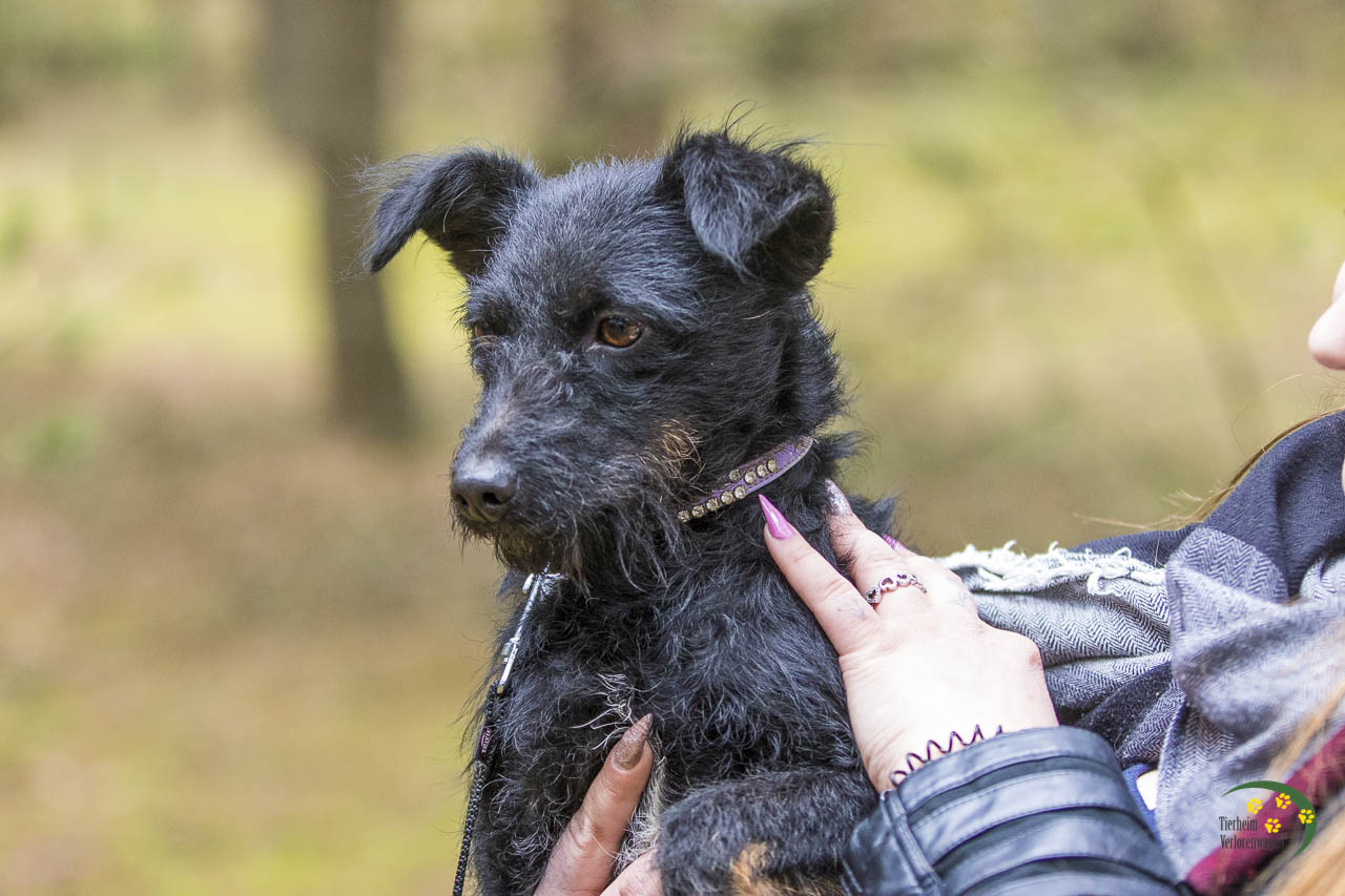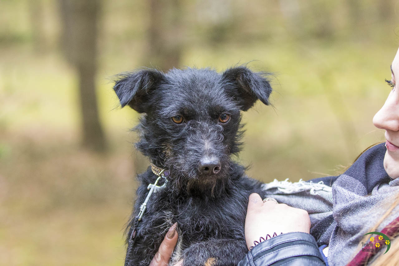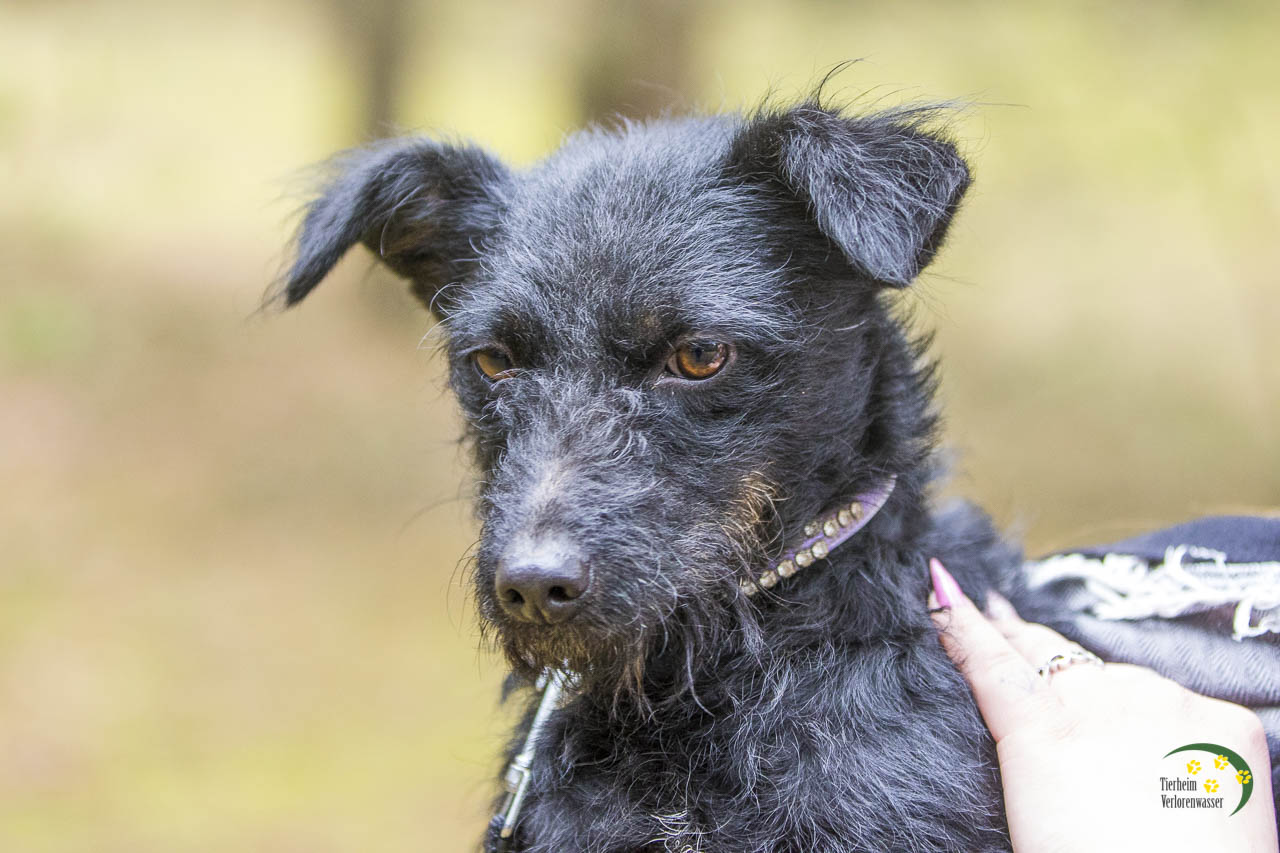 Hilde sieht ein wenig nach einem Schnauzer-Mix aus. Mit ihren gerade mal 8 kg ist sie aber eher die Zwergausgabe.